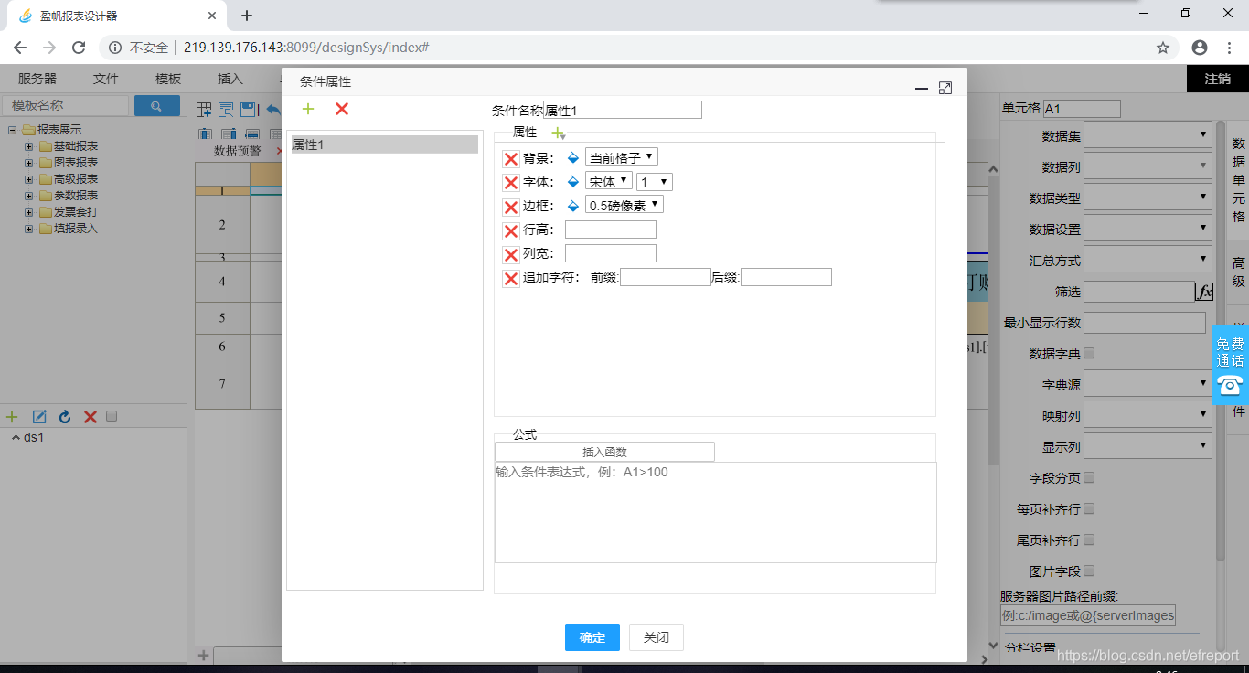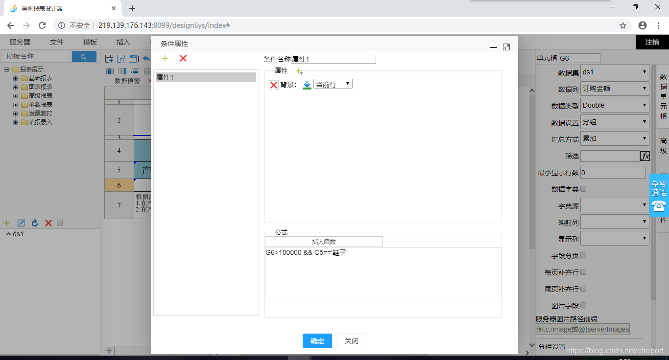 说明:报表里条件属性就是给报表设置背景、字体、边框、行高、列宽、追加字符等属性。报表中有数据集的存在,想要灵活在工作表中加属性,就要用到条件属性了。