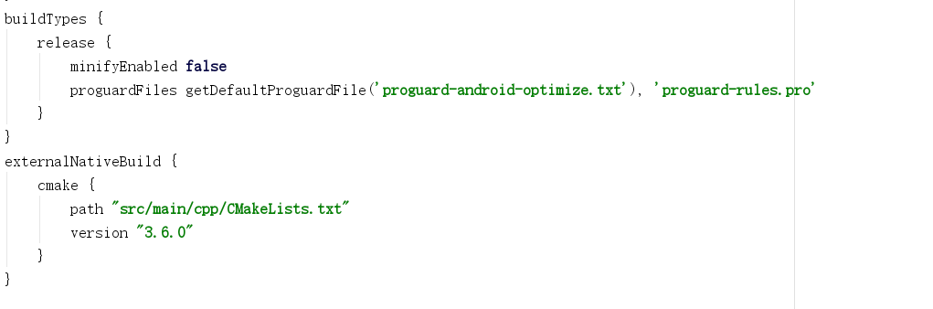 externalNativeBuild { cmake { path "src/main/cpp/CMakeLists.txt" version "3.6.0" } }看到