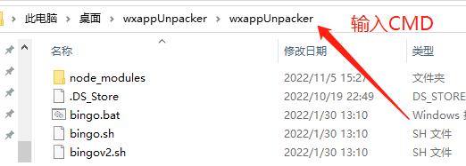 正式用到大神开发的【wxappUnpacker】了。下面的操作,都是在cmd命令窗口中操作的,需要强调的是,必须在wxappUnpacker路径里才可以,简易方法是,直接在【wxappUnpacker】文件夹的地址栏里输入cmd即可。