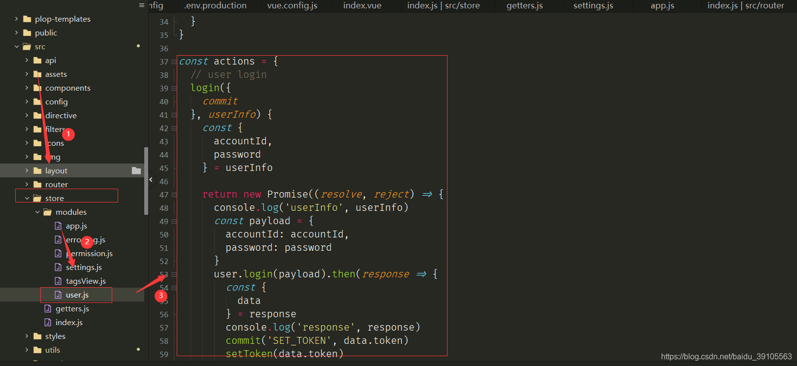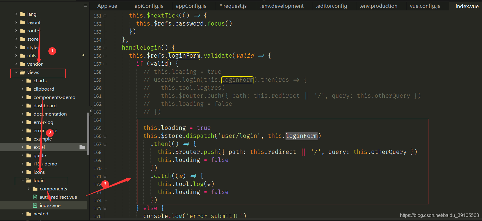 6、在src-view-login-index.html文件中,找到Vue-Element-Admin的登录接口,添加如下代码,如图,把官方的请求方式注释掉,this.loginForm是请求参数