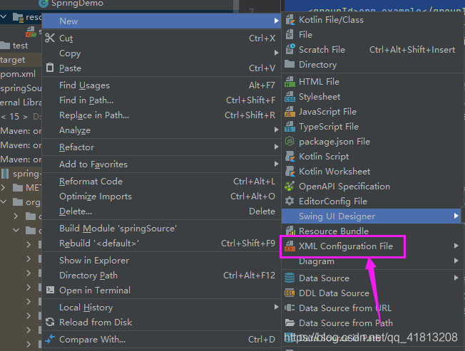 关于spring容器的配置文件,在idea插件市场搜索spring,安装该插件,在右键有一个xml的选项,选择这个即可