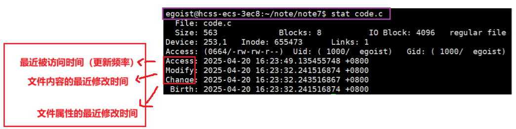 在指令章节介绍了stat指令,它可以列出一个文件的访问、内容修改、属性修改时间。