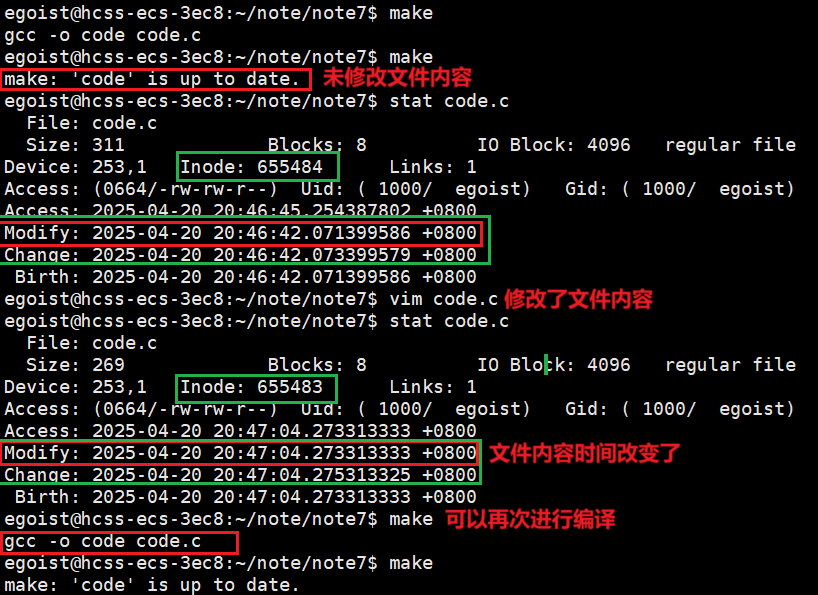 在下图中,我们对一个未修改文件进行修改时,其文件内容最近修改时间发生了变化,此时可以重新make了。