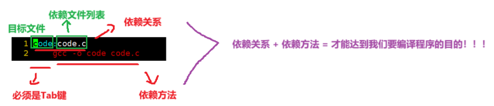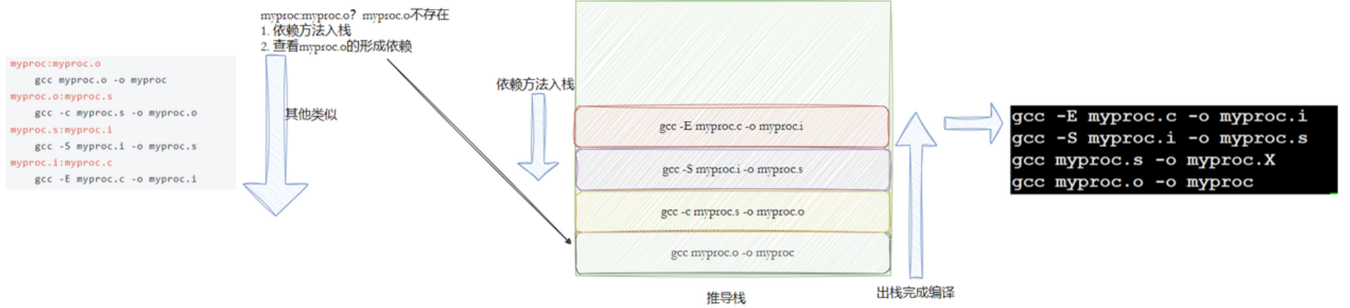 - 如果 myproc 所依赖的 myproc.o ⽂件不存在,那么 make 会在当前⽂件中找⽬标为myproc.o ⽂件的依赖性,如果找到则再根据那⼀个规则⽣成 myproc.o ⽂件。(像⼀个堆栈的过程)