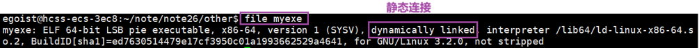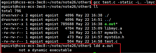 可以看见我们的libmyc.a没有在里面,即查不到静态库的依赖,因为静态库把自己的代码合并到里面了.如何证明呢?