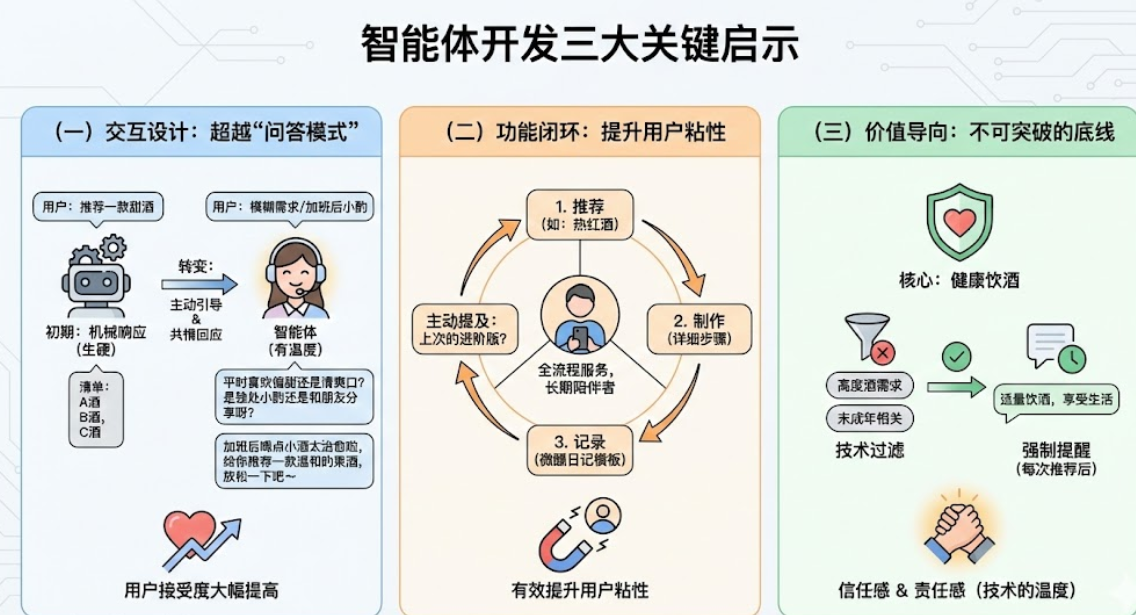 单一功能难以留住用户,我们从“推荐-制作-记录”全流程出发,构建功能闭环。例如,为用户推荐热红酒后,不仅提供详细的制作步骤,还会自动推送“热红酒微醺日记”模板,引导用户记录制作过程、口感感受与心情变化;下次用户再次使用时,会主动提及“上次你记录的热红酒很受欢迎,要不要试试同款配方的进阶版?”。这种全流程服务让Agent不再是“用完即走”的工具,而是成为用户微醺生活的“长期陪伴者”,有效提升了用户粘性。