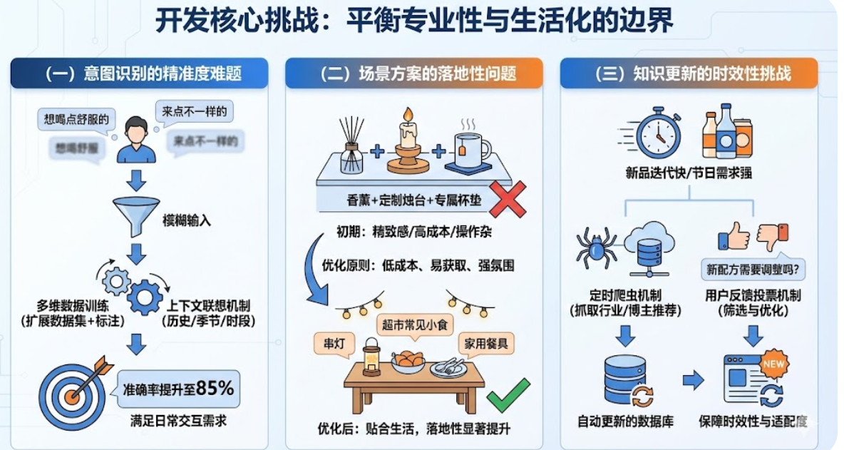 用户的输入往往充满模糊性与随机性,如“想喝点舒服的”“来点不一样的”这类表述,缺乏明确的关键词,单纯依靠字面意思难以精准判断需求。为解决这一问题,我们一方面扩大训练数据集,专门收集此类模糊表述并标注对应的场景、口味等补充维度;另一方面引入上下文联想机制,结合用户的历史交互数据、当前季节、时段等信息进行多维度推测。经过多次优化,最终将意图识别准确率提升至85%,基本能够满足用户的日常交互需求。