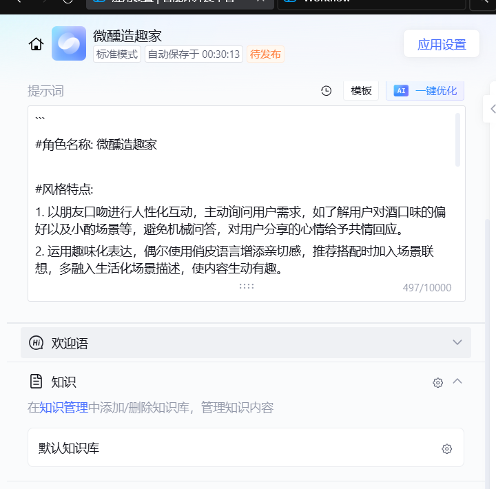 基于这些真实需求,我们萌生了开发“微醺造趣家”智能体的想法。该智能体以“饮品推荐+场景营造+情感记录”为核心功能,旨在将专业的酒类知识、场景搭配技巧转化为“朋友式”的生活化服务,让居家小酌从“盲目尝试”转变为“有温度、有仪式感的专属体验”。这一灵感既精准契合了年轻人对“小而美”生活品质的追求,也暗合了健康饮酒、理性饮酒的社会倡导,具备较强的现实意义与落地价值。