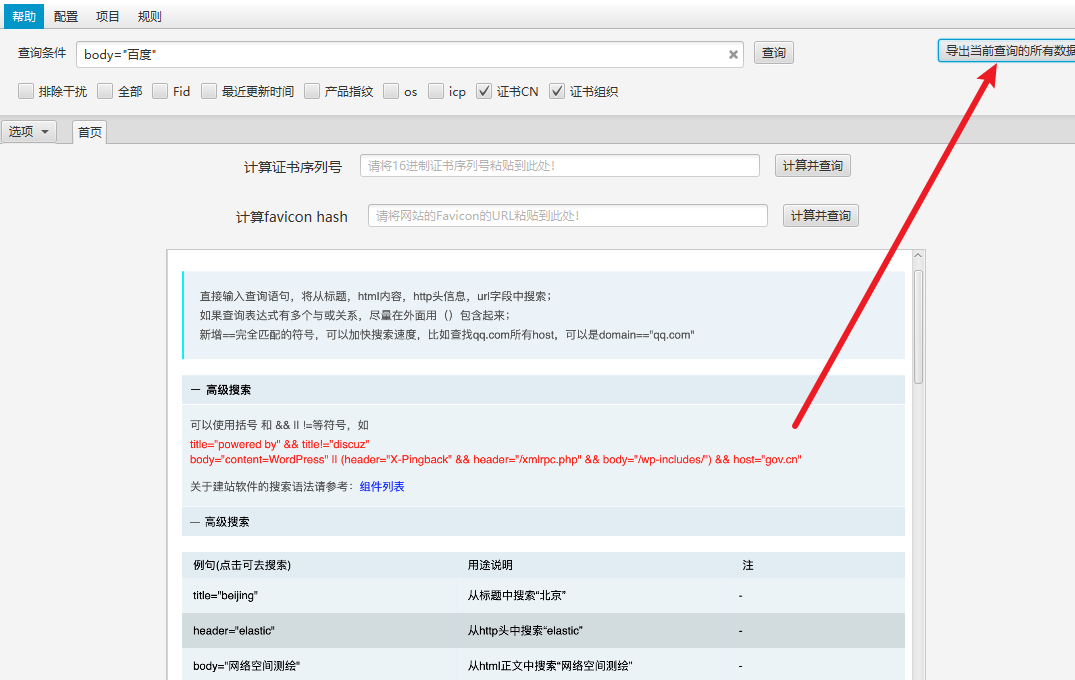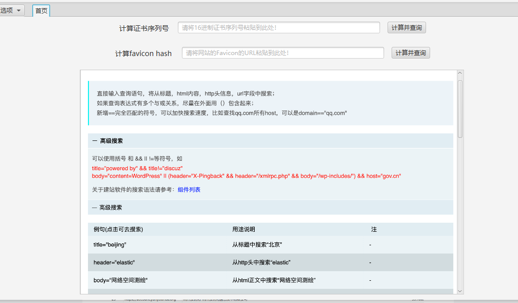 使用方式跟fofa是一样的,首页也有相应的语法进行查看