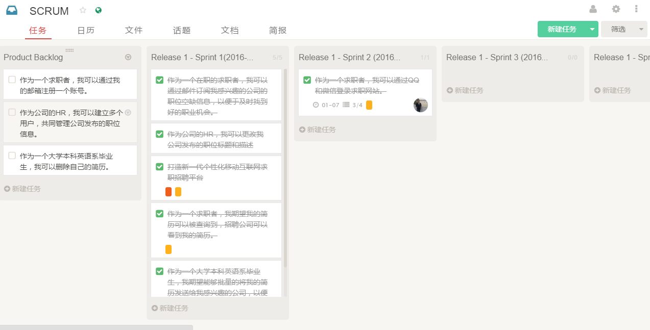 了解了Scrum开发流程之后,我们使用Worktile 和敏捷白板这两个工具来进行敏捷管理,使用Worktile 可以进行任务的分配、归档,如下所示:
