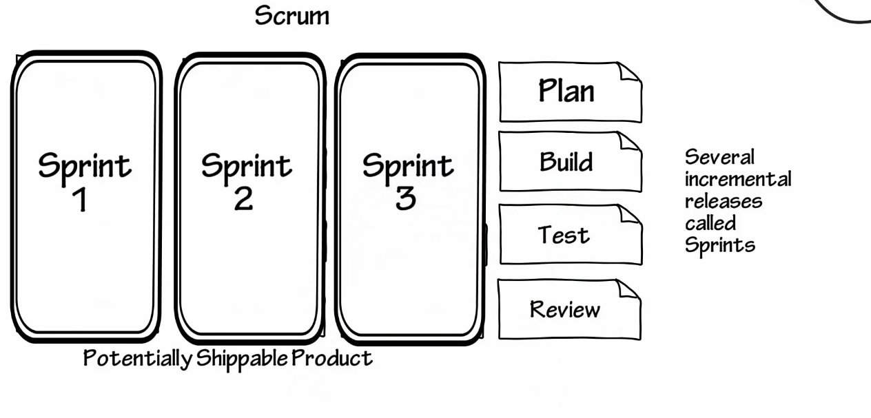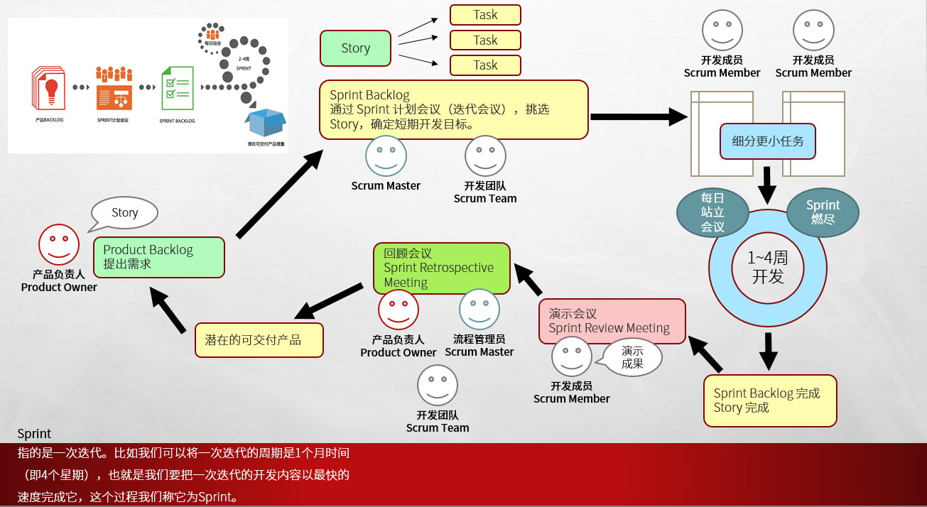 正如上述那样,Scrum是一种迭代和增量式的产品开发方法。Scrum通过Sprint来实现迭代,Sprint是短距离赛跑的意思,这里面指的是一次迭代。一个Sprint是指一个1周-4周的迭代,它是一个时间盒。Sprint的长度一旦确定,保持不变。Sprint的产出是“完成”的、可用 的、潜在可发布的产品增量。Sprint 在整个开发过程中的周期一致。新的 Sprint 在上一 个 Sprint 完成之后立即开始。 Sprint 包含并由 Sprint 计划会议、每日站会、开发工作、Sprint 评审会议和 Sprint 回顾会议构成。