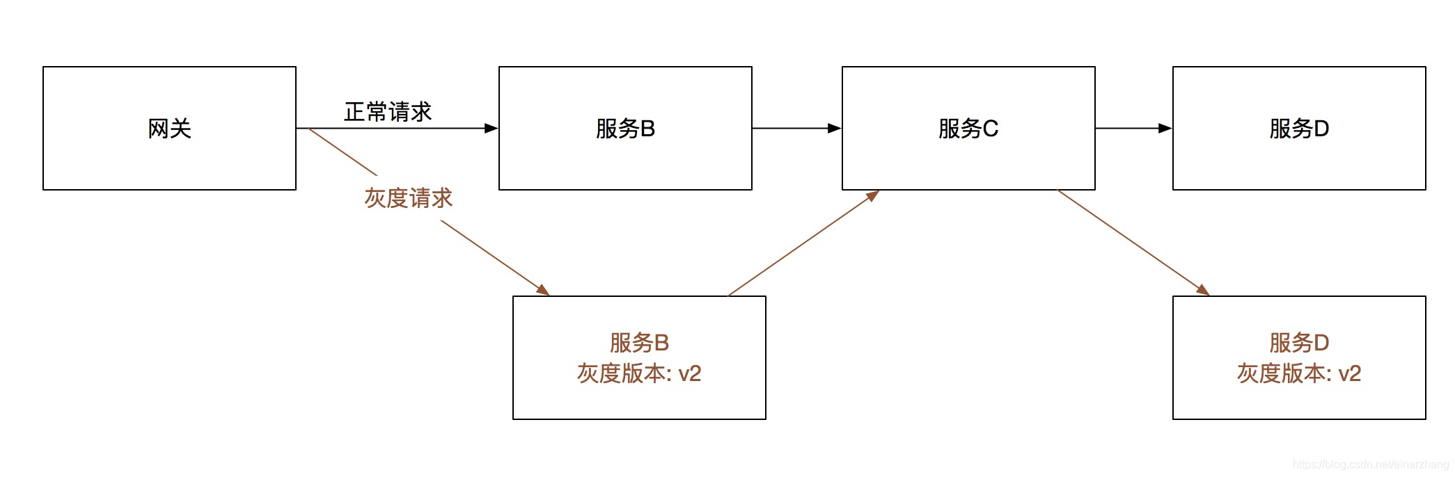 通过灰度发布, 我们希望做到任意链路的服务都能通过灰度规则请求到, 如下图所示: