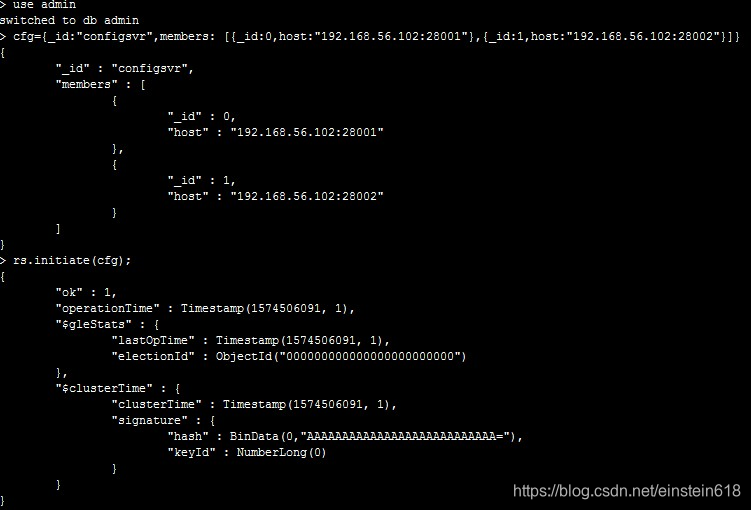 cfg={_id:"configsvr",members: [{_id:0,host:"192.168.56.102:28001"},{_id:1,host:"192.168.56.102:28002"}]}