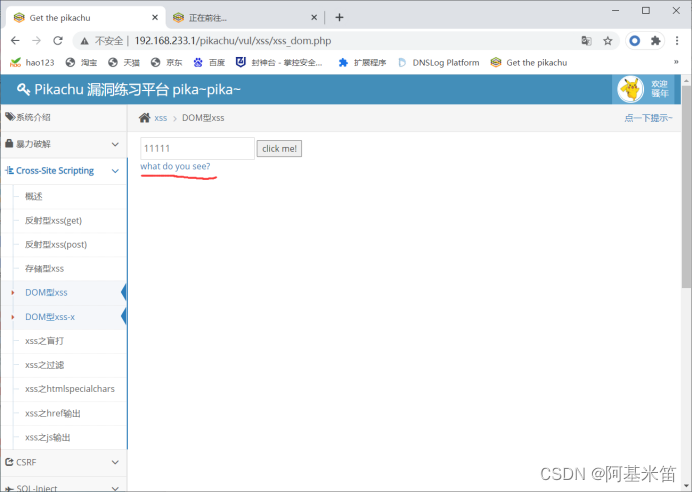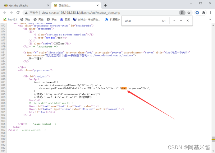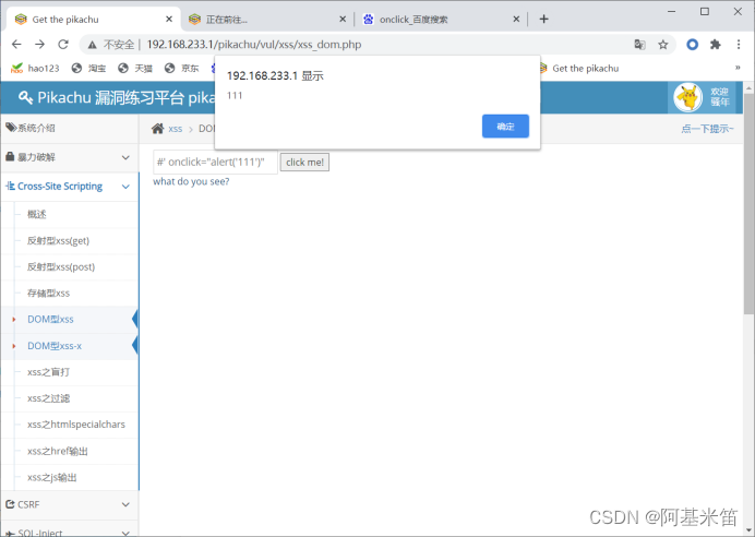 进行代码审计(分析代码),构造闭合,通过分析可得我们所要闭合的代码为<a href='"+str+"'>what do you see?</a>,str为输入的参数,因此构造为<a href=’3’ onlick=”alert(‘111’)”>what do you see?</a>,最终输入为#' onclick="alert('111')"