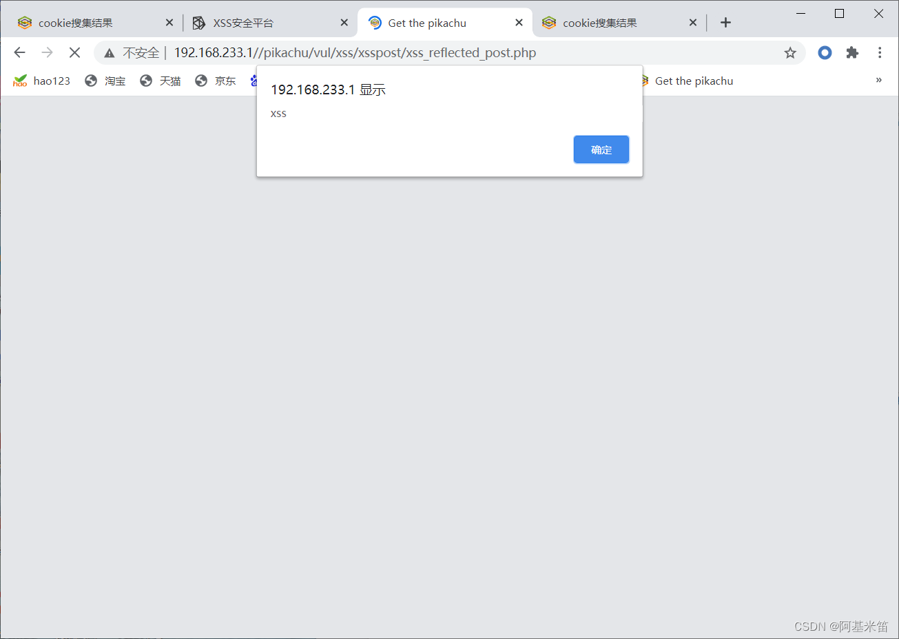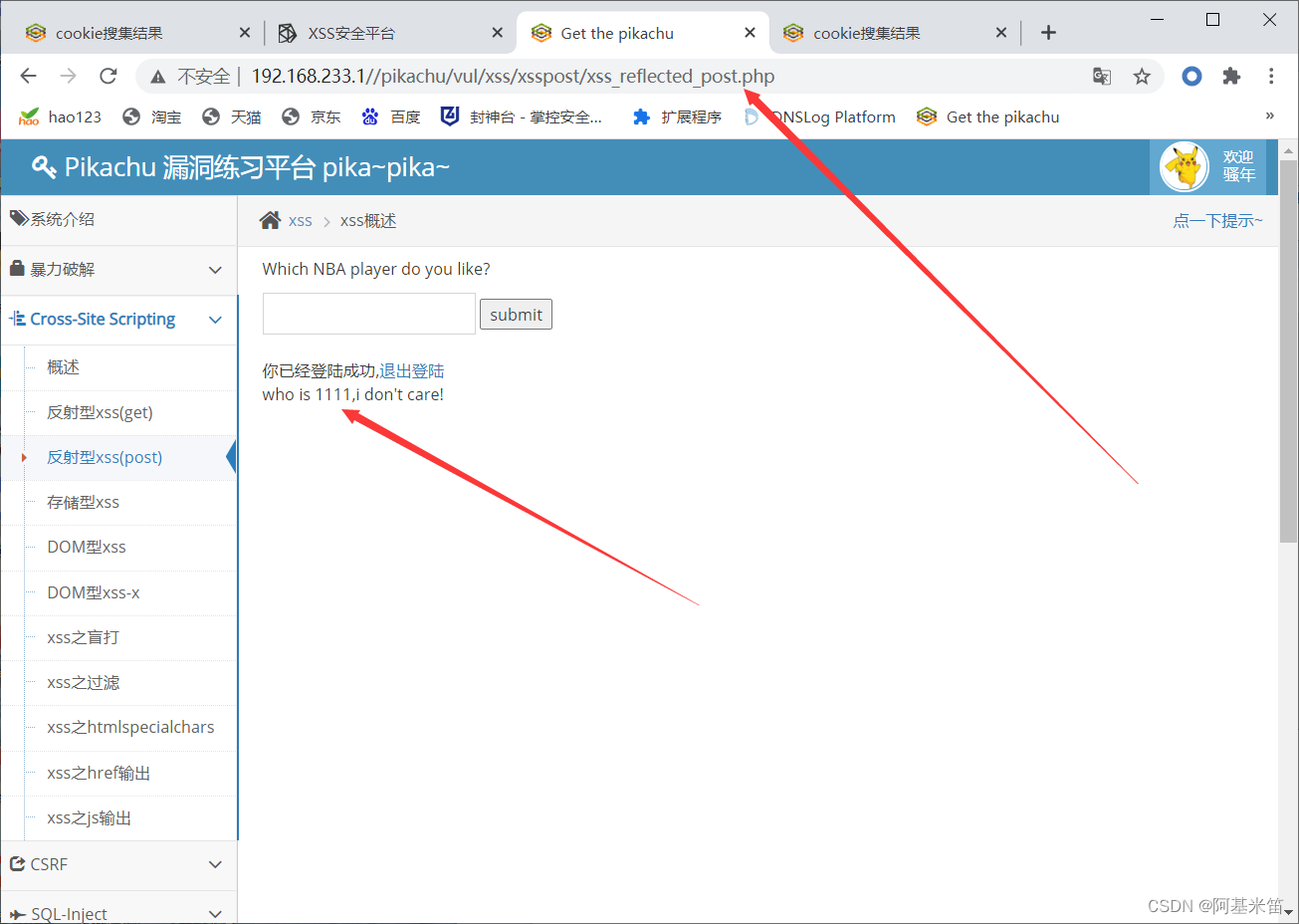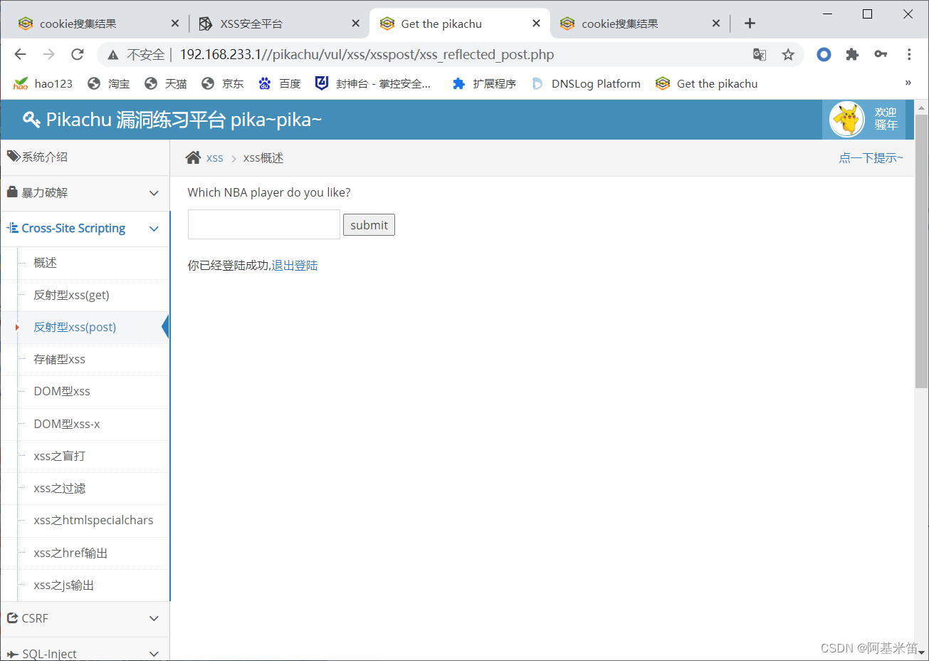 可以看到脚本被执行了,这时我们就可以用pikachu自带的xss平台来获取cookie了