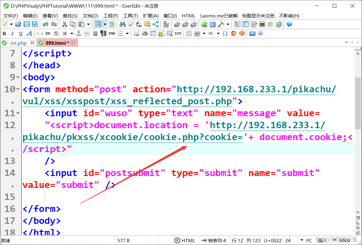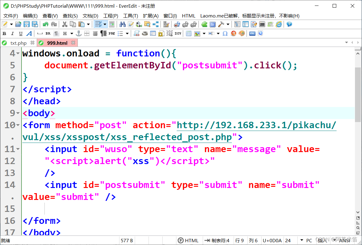 可以看到在url栏里面并没有传参所以时POST传参,POST传参时我们就不能直接复制url了(因为url里面并没有传参值,所以我们精心构造的xss脚本就没用了),但是我们可以构造一个网页,在网页里面进行POST传参,让对象访问我们构造的网页,来间接的执行我们的xss脚本,下面看一看构造网页的源码
