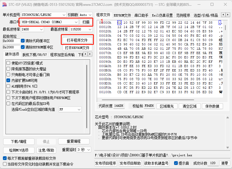 2. 先选中我们的串口号,然后在点击下面的程序文件,然后找到我们的程序编译后的 .hex 文件。