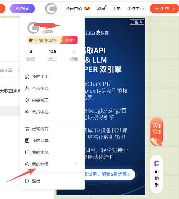 鼠标选择你的个人头像,下拉列表选择我的等级