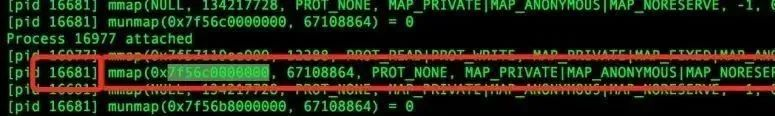项目启动使用strace追踪系统调用,发现确实申请了很多64M的内存空间,截图如下: