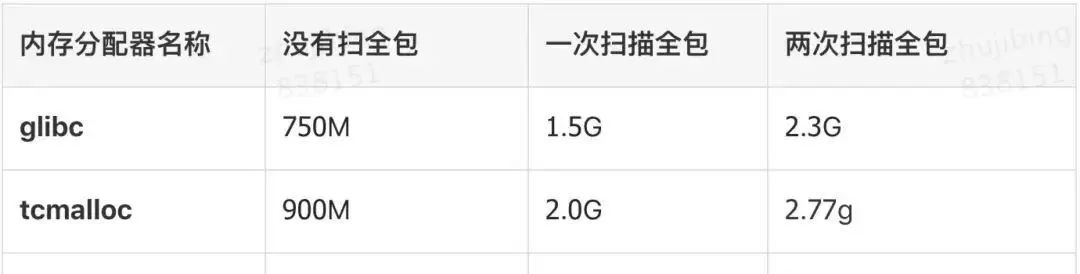 笔者做了一下测试,使用不同分配器进行不同程度的扫包,占用的内存如下:
