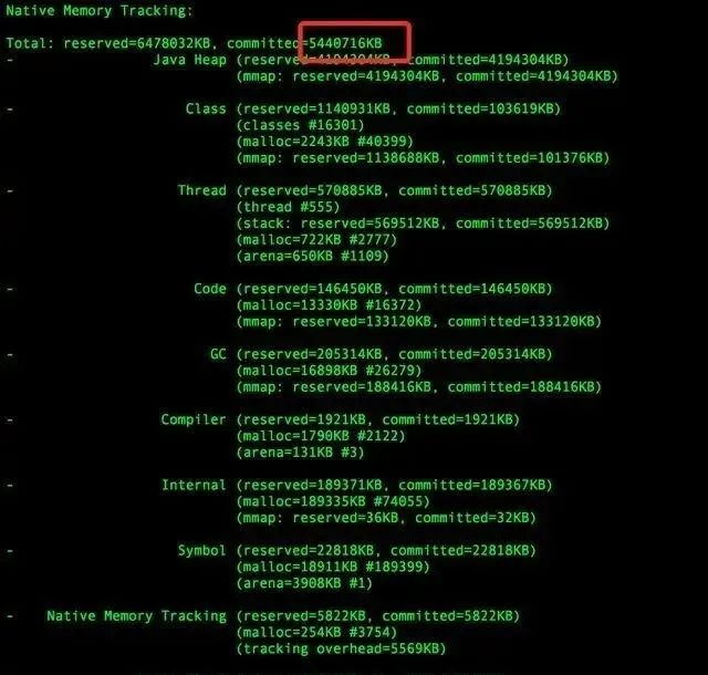 发现命令显示的committed的内存小于物理内存,因为jcmd命令显示的内存包含堆内内存、Code区域、通过unsafe.allocateMemory和DirectByteBuffer申请的内存,但是不包含其他Native Code(C代码)申请的堆外内存。所以猜测是使用Native Code申请内存所导致的问题。