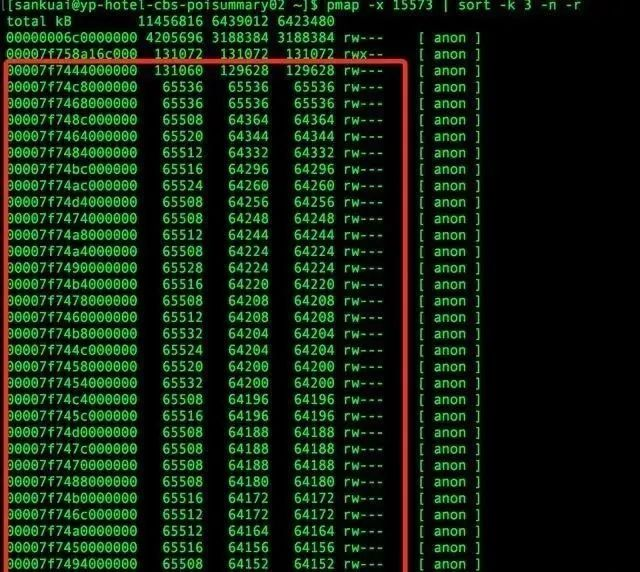 为了防止误判,笔者使用了pmap查看内存分布,发现大量的64M的地址;而这些地址空间不在jcmd命令所给出的地址空间里面,基本上就断定就是这些64M的内存所导致。关注微信公众号:互联网架构师,在后台回复:2T,可以获取我整理的教程,都是干货。