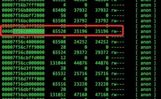 因为使用strace没有追踪到可疑内存申请;于是想着看看内存中的情况。就是直接使用命令gdp -pid pid进入GDB之后,然后使用命令dump memory mem.bin startAddress endAddressdump内存,其中startAddress和endAddress可以从/proc/pid/smaps中查找。然后使用strings mem.bin查看dump的内容,如下: