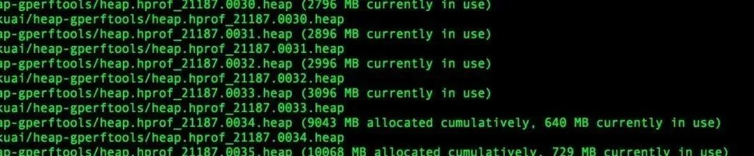 这时,再返过来看gperftools的内存分布情况,发现使用Spring Boot时,内存使用一直在增加,突然某个点内存使用下降了好多(使用量直接由3G降为700M左右)。这个点应该就是GC引起的,内存应该释放了,但是在操作系统层面并没有看到内存变化,那是不是没有释放到操作系统,被内存分配器持有了呢?