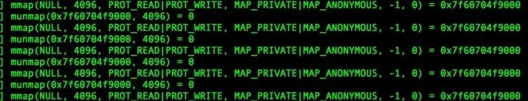 因为使用gperftools没有追踪到这些内存,于是直接使用命令“strace -f -e”brk,mmap,munmap” -p pid”追踪向OS申请内存请求,但是并没有发现有可疑内存申请。strace监控如下图所示: