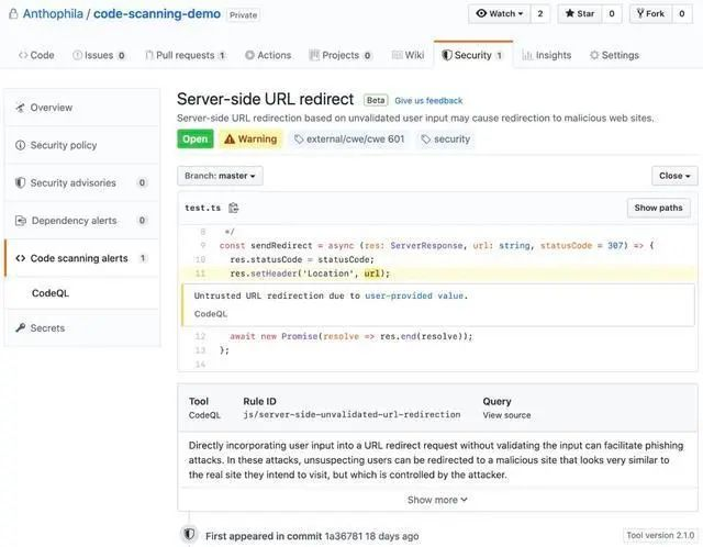 为了提高安全性,GitHub 还宣布了两项新功能,分别是 Code scanning 和 Secret scanning。Code scanning,该功能对开源项目免费提供,可以检查用户的代码是否存在潜在的安全漏洞,并由 CodeQL 驱动。而 Secret scanning 则是针对私有代码库,它可以观察私有代码库中是否存在已知的秘密格式,如果发现有秘密格式,就会对开发者进行识别。关注微信公众号:互联网架构师,在后台回复:2T,可以获取我整理的教程,都是干货。