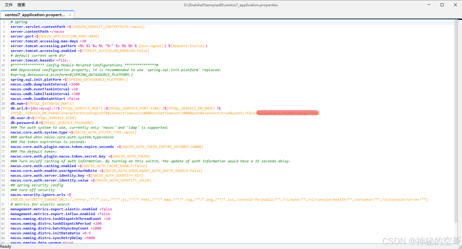 要打开这个文件,在我标注的位置上加上&allowPublicKeyRetrieval=true,至此才全部结束~