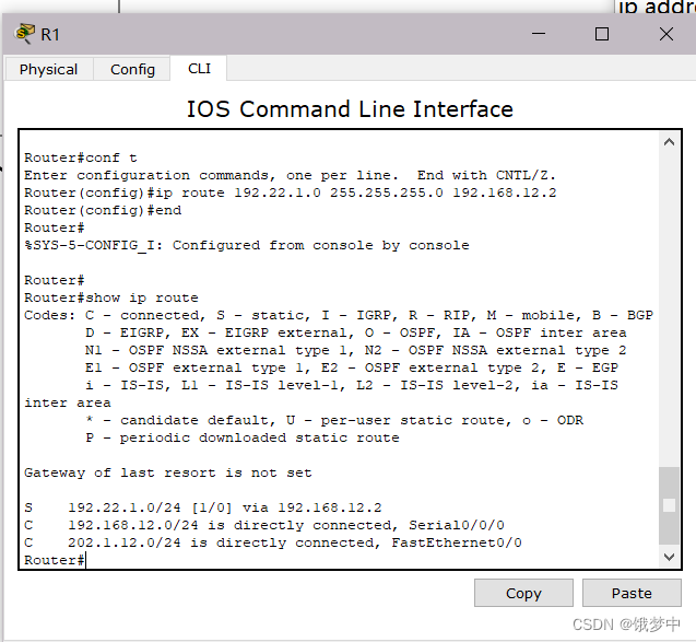 配置完成后可以采用 show ip route 的命令进行端口的查看