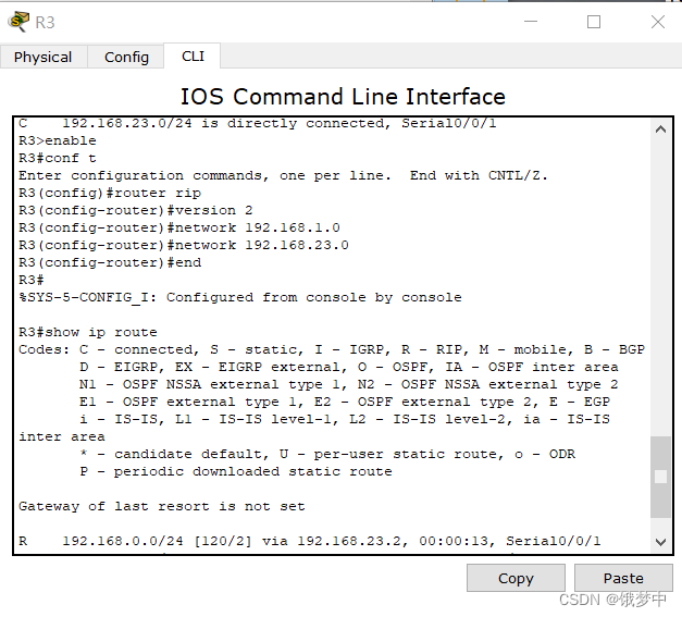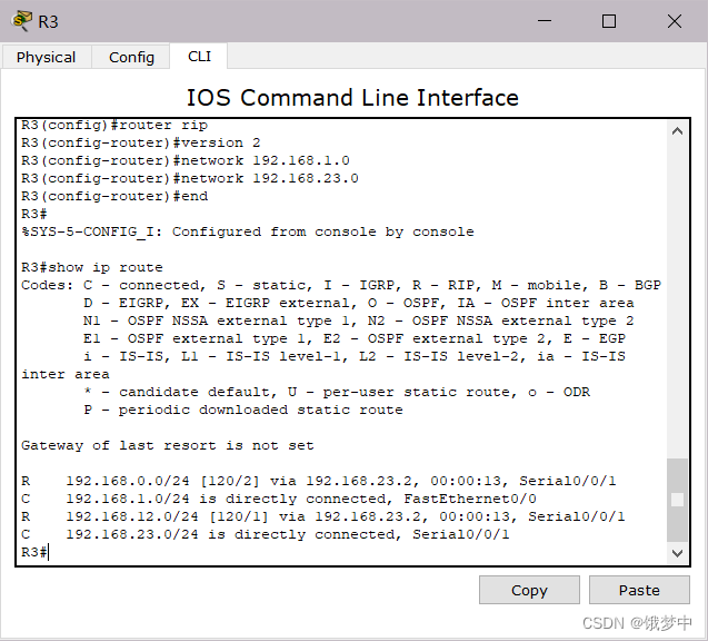 进入全局模式,启动rip模式的版本2,把直接相连的网络告诉rip协议对路由器R1,R2,R3进行同样的配置,上图只截取了对R3的命令配置,命令如下