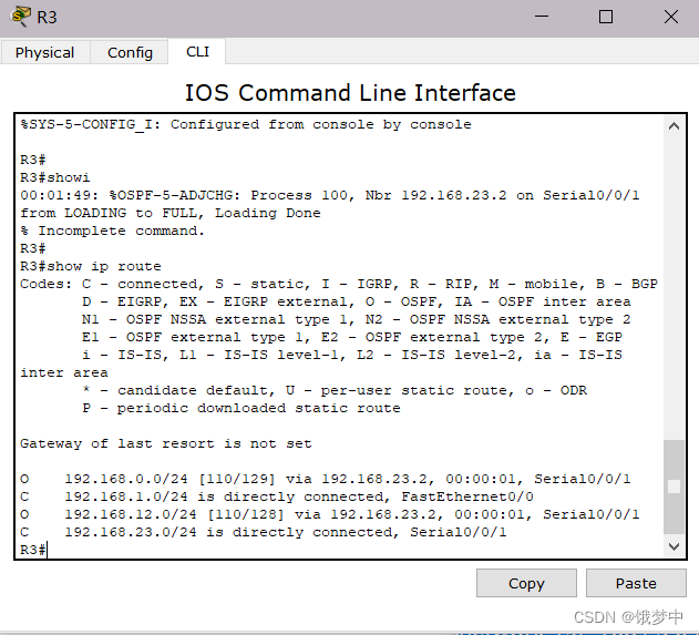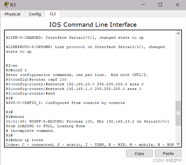 还是依次对路由器R1,R2,R3进行配置,不过对于区号需要写的一样,才会载同一个的网络中,命令如下