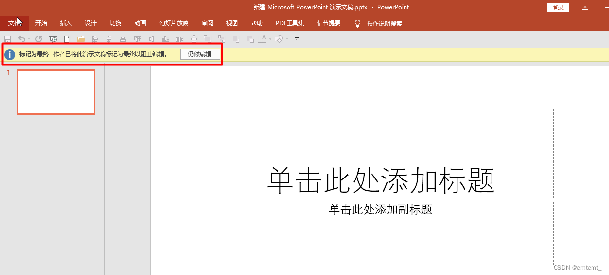 选中【标记为最终】,那么下次打开演示文稿会提醒是最终版本,不能编辑(除非启用编辑)