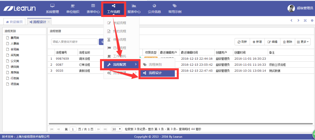 6.下面就是工作流的设计了,点击工作流程—流程管理—流程设计