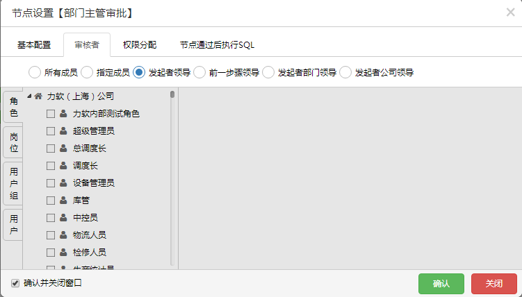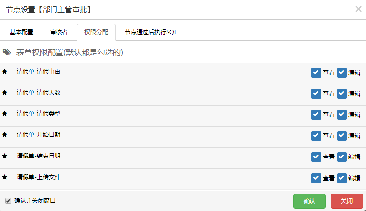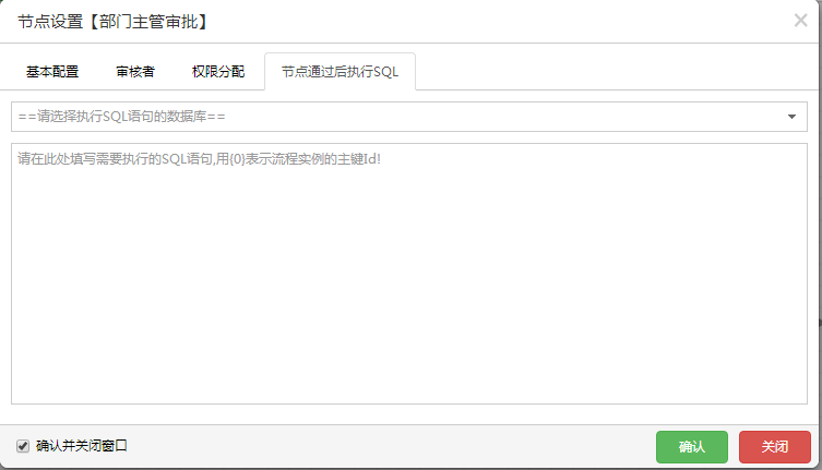 10.对流转经过的节点进行设置,包括基本配置、审核人员设置及审核人员的权限设定、SQL语句的设定(以部门主管审批节点为例,其他节点略过)