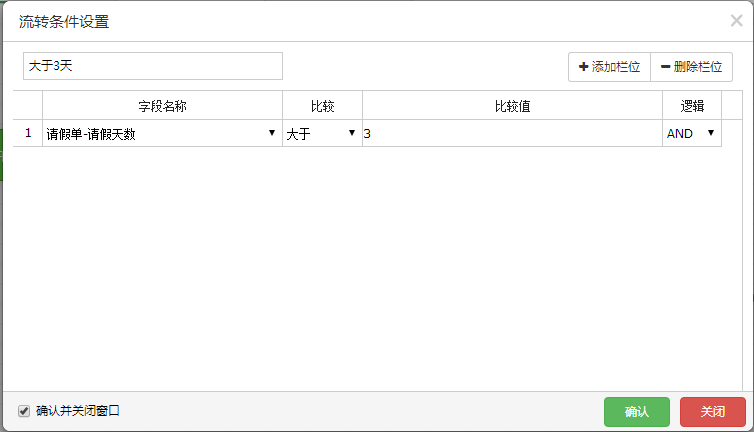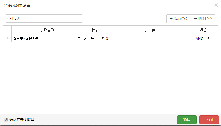 11.下面进行对流转条件的设置(字段会根据你选择的表单自动整合到下拉框中,条件可以设置多个)