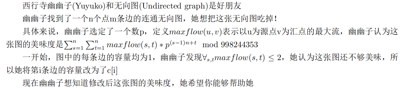 并查集维护每一个集合的∑p(i−1)n,∑pi\sum p^{(i-1)n},\sum p^i∑p(i−1)n,∑pi,由于分配律所以两个集合的贡献相乘就是整个集合的贡献