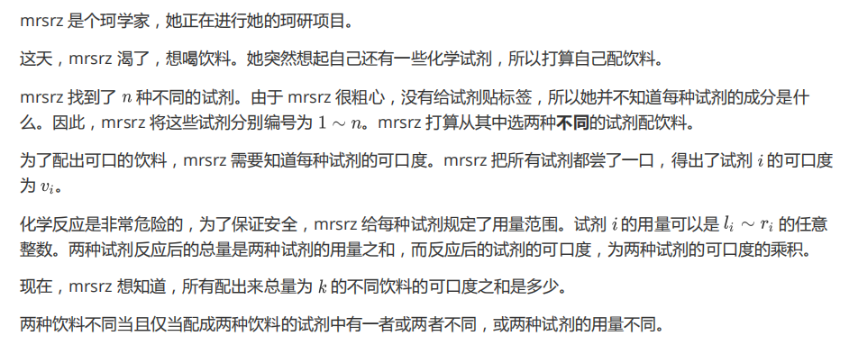这道题目考察了O(n^2)枚举方法和独特的饮料配比概念,由于每种配比的可口度不同,使得问题看似复杂。通过分析试剂合并的贡献,可以发现其形成的序列特性,利用差分技巧简化计算,最终通过两次前缀和还原原始数组,得出解决方案。