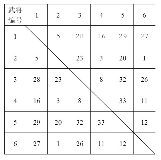 下面举例说明计算机的选将策略,例如,游戏中一共有6 个武将,他们相互之间的默契值如下表所示