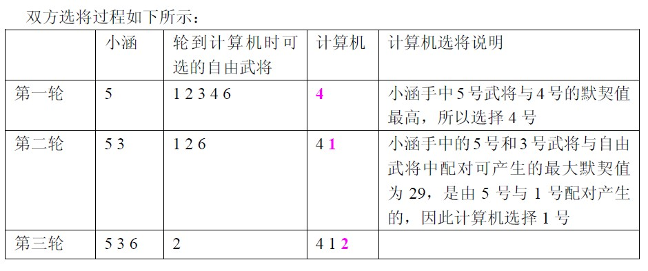 已知计算机一方选择武将的原则是尽量破坏对手下一步将形成的最强组合,它采取的具体策略如下:任何时刻,轮到计算机挑选时,它会尝试将对手军队中的每个武将与当前每个自由武将进行一一配对,找出所有配对中默契值最高的那对武将组合,并将该组合中的自由武将选入自己的军队。