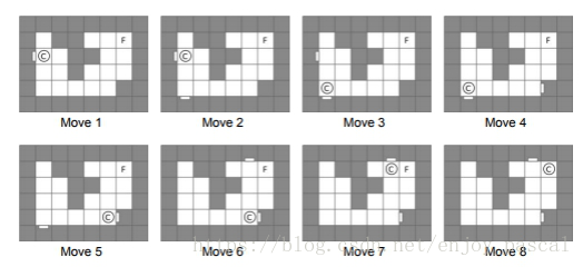 地图四周都是墙,问主角最少用多少时间从C走到F。C和F